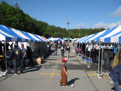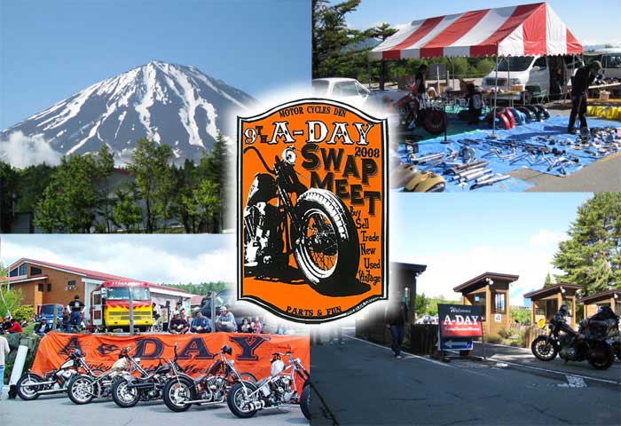 | 自分には要らないモノでも他の人には必要なモノかも知れない。そんなエコでリサイクルな出会いを求めて出展して来ました、富士は裾野のA−DAYスワップミート。 今回初めて参加させて頂いたのですが、その経緯はと言うと、当店は中古車屋を自認する三流チョッパーショップですのでベース車から外された幾多のパーツが何年もの間に溜まり、さして広くもない倉庫がパンク寸前。いいかげん在庫を一掃すべしと考え、機会を伺っておりましたが、同じ出向くならあの有名なA−DAYスワップミートにと早速アポをとったしだいです。 一週間ほど前からバタバタと部品の選別仕分けにかかりましたが、どのようなモノが関東ではウケルのかまったく予想できませんでしたので、とりあえず積めるだけ持っていこうと欲張った結果、自動車3台分もの積荷となってしまいました。ちなみに売り上げ目標はこちらも欲張って50万円です。 大阪からの出展でしたので前日、土曜日の昼過ぎから会場に向かい生憎の雨模様の中、バイクで自走するツワモノ達と一路東へと車を走らせました。夕方には会場に到着しましたが、会場内は出展者の入りもまだ少なく、空きテントが目立つ状態で雨も降り止まず、なにより気温10度を下回る寒さが堪えましたね。富士の裾野とはいえ標高が高いので、当然といえばそうなのかも知れませんが、「会場の夜は寒いよ。」との前情報もあったんですけど、これほど寒いとは全くの予想外で、急遽購入した炭火で暖をとり、明日は晴れるでしょうという予報を期待しつつ夜を明かしました。 |