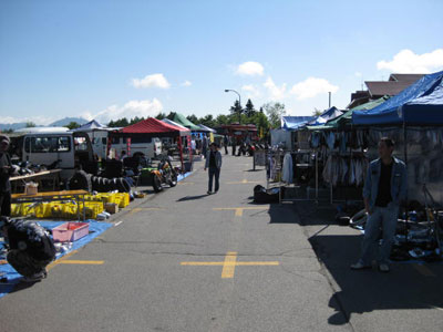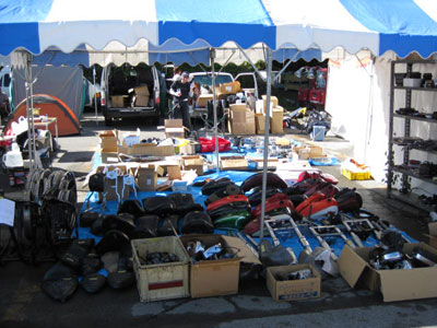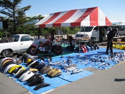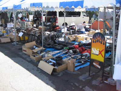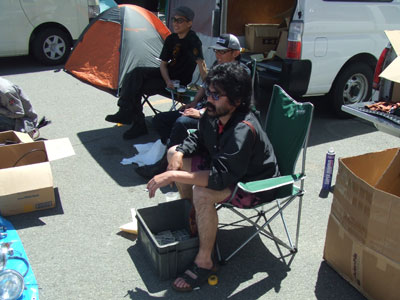 | では、我々シックス・ブースはと言いますと、足の踏み場もないほどの詰め込み加減。商品の陳列だけで素人さが滲み出ております。 | しかも、ブース裏の駐車スペースまで出展スペースにしています。なりふり構わぬベタな大阪の商人根性丸出しの店構えと化しておりました。 |