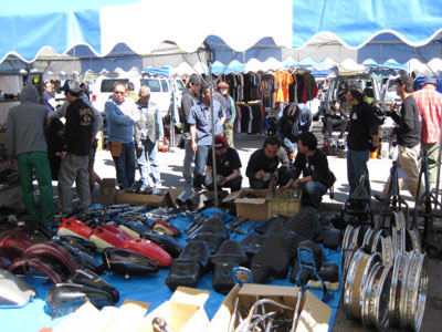 | 9時会場のその瞬間、サングラスに隠された表情が引き締まるシックスの番頭。当店の辛口コメントで一部のマニアに有名なブログ番頭日記は彼の手によるもの。ちなみに足元の箱は金庫だそうです。 | 開場そうそう待ちわびた来場者が、お目当てのブースにどっと押し寄せます。当ブースにもお客がちらほらと足を運んでくれますが、商品量だけは異常に多いので部品探しも一苦労でしょう。 |