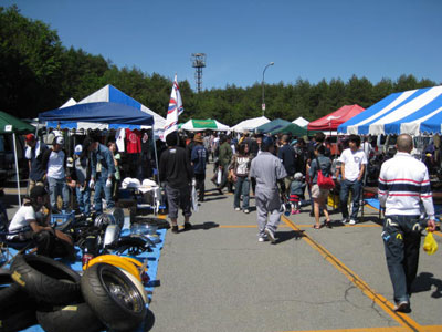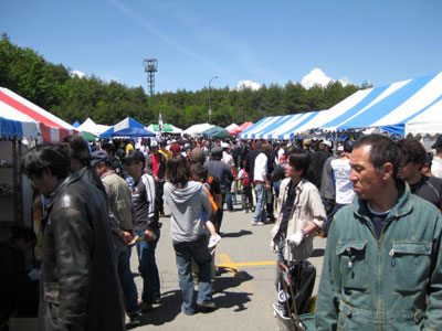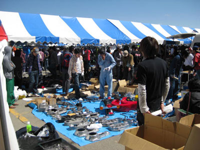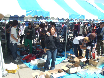 | 裏の違反スペースにも、お客がやって来ます。中央の男性、ツナギに軍手とは手馴れていますね。スワップミートならではの光景でしょう。 | 女性のお客も、たくさんいらっしゃいました。その手にある純正ライザー、お値段安くしときまっせ。 |