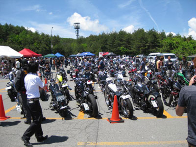 | ミーティングの楽しみの一つでもあるバイク・ウォッチング。会場内の駐車スペースの写真ですが、関西とはまた一味違ったテイストで良いですね。 | 関東勢の中、大阪から同行したチョッパーも昨日とはうって変わった強い日差しの中、疲れた車体を休めております。しかし、夕方には出発ですよ。 |