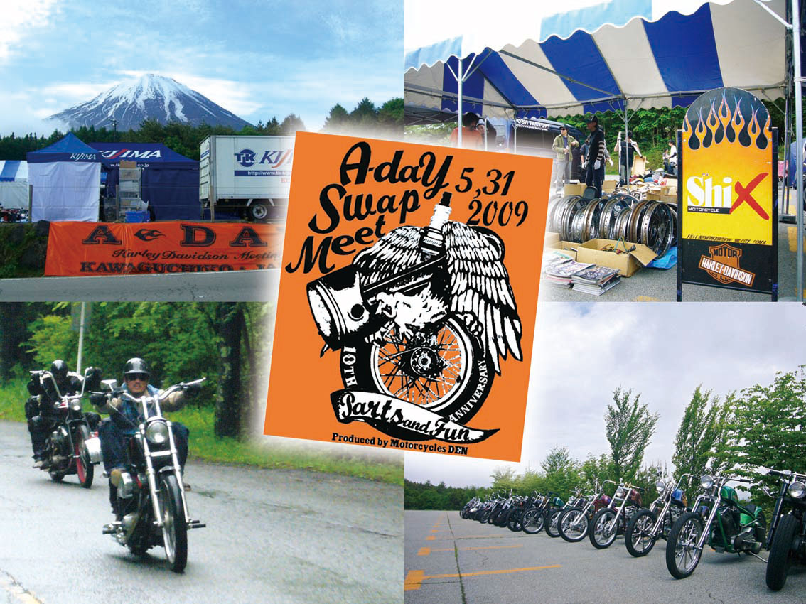 今年も行ってまいりました、第10回A-dayスワップミート。チョッパーショップならどのお店でも頭を悩ましているであろうチョッパー製作段階で発生する余剰パーツの処理問題。個人経営の零細企業が大半を占めるこの業界でチョッパーを造れば造るほど溜まる余剰パーツに対して店舗の小ささゆえに倉庫問題で困っている経営者にとっての問題解決の場所、それどころか廃材処理費を払うことなく反対に結構な額のお金になるという、まさに捨てる神あれば拾う神有りのことわざを地でいく存在でもある弱小ショップにとっての夢のイベントであります。 |