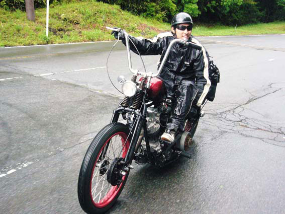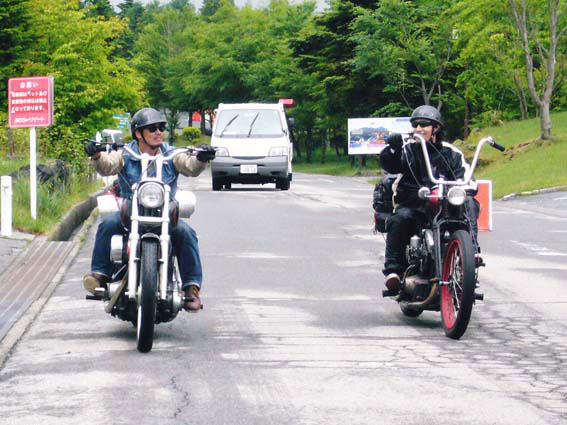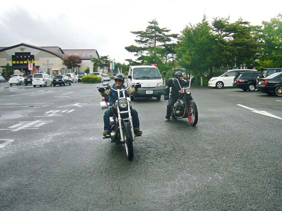 時間が飛んでその日の夕刻、会場近くの道の駅での写真なんですが、読者の期待のとうり雨が降りだしました。ここまでの道中は雨の気配はなかったのですが、どうやら富士山の近辺の天気は平地に比べて不安定なようですね。おまけに気温もぐっと下がって肌寒くなってきました。このような時、フェンダーの有無で身体の濡れ具合がはっきりと出ます。チョッパーならフェンダーレスは暗黙の了解みたいなところがあるんですが、天候や道路事情による疲労度は容赦なく乗り手にかかってきます。チョッパーは実にハードな乗り物だということが、こうして比べてみると解ります。 |