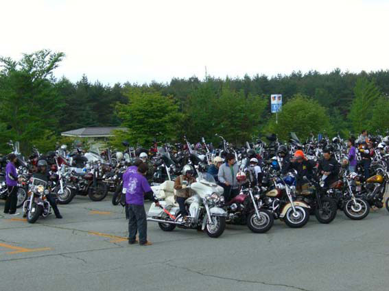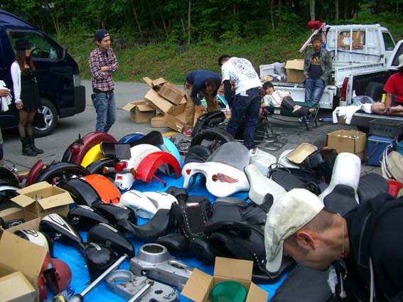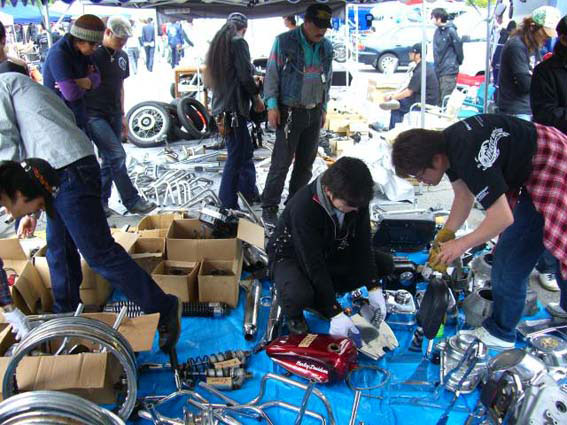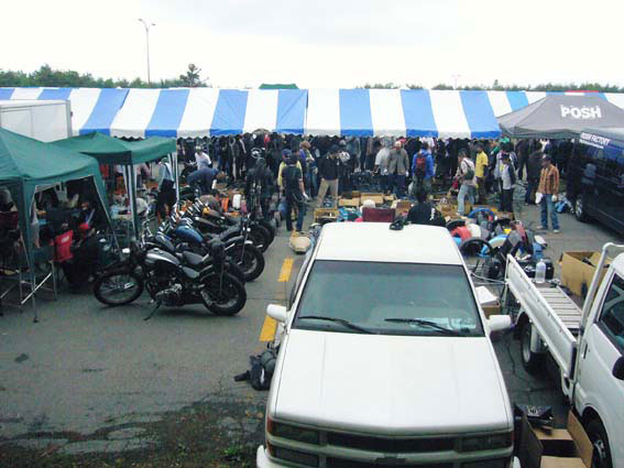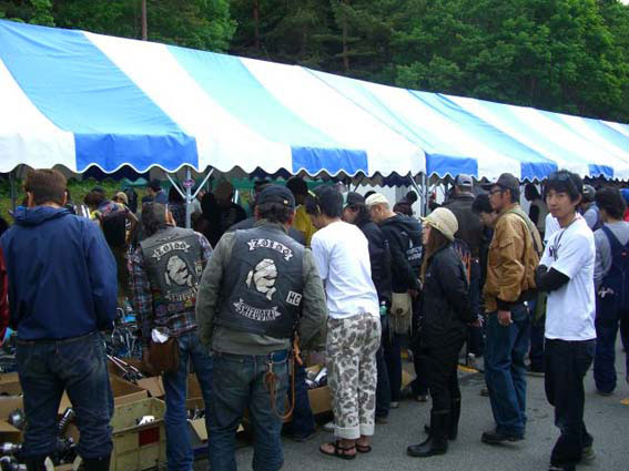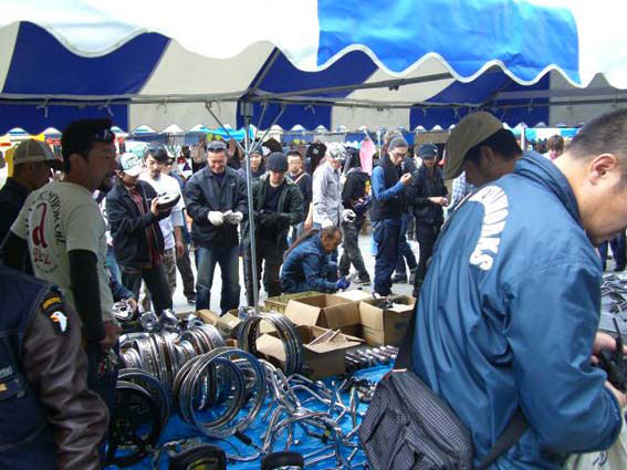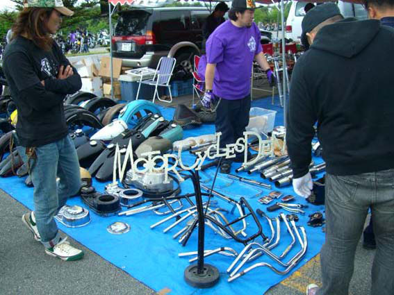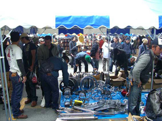 | 開場、数秒の間にブースにどっと押し寄せる来場者の皆様方。シックスモータースは頑なにスタンダードなチョッパー製作を旨としていますので、いにしえのお宝パーツなどはありませんが、その分とてもリーズナブルな価格設定となっています。自身でショベルやエボをイジる方には良い買い物が出来たのではないでしょうか。 さらにスワップミートならその場での値引き交渉はお約束。さらにシックスの売り手は関西人ボランティアの素人集団、しかも昨夜からの過剰なアルコール摂取の影響でまともな思考回路が働いていませんので、値段はお客さんの言い値となりほとんど捨て値価格でのご奉仕提供となりました。 ちなみにクルマの荷台に赤シャツ姿で新興宗教の教祖のごとく偉そうに鎮座しているのが、プログで辛口毒舌ボヤキで有名なシックス番頭なんですが、彼が一番酔っていたようで、いつ用意したのか小さなメガホンを取り出し、時折思い出したように「売上げ目標!○□△@!」など意味不明なことを叫んでいました。隣にちょこんと色っぽく座っているのが最近クルマのCMでよく見るシックスの一日子供店長となります。 |