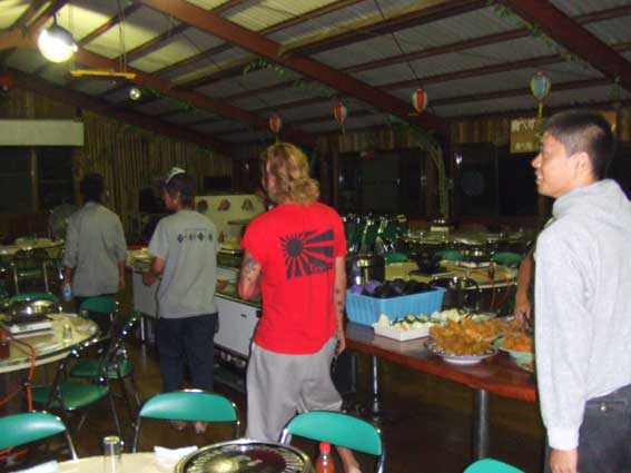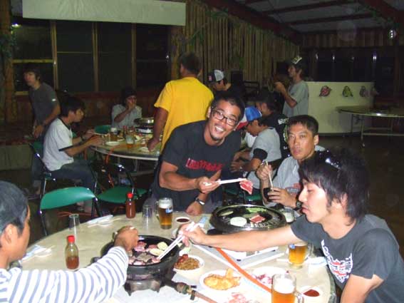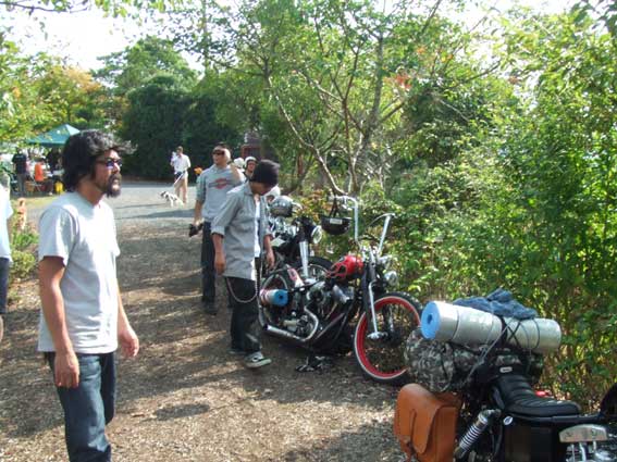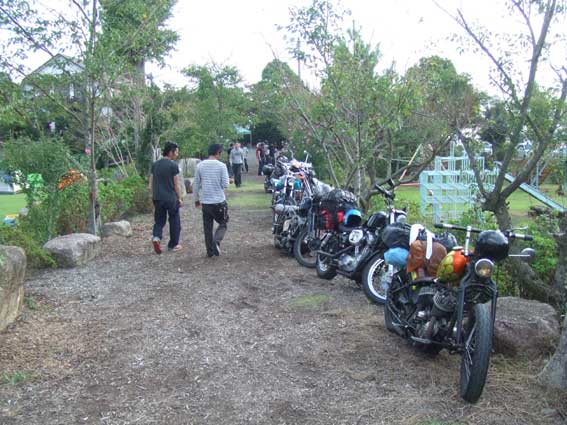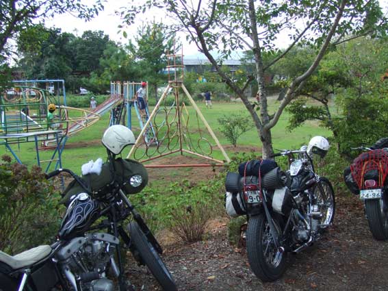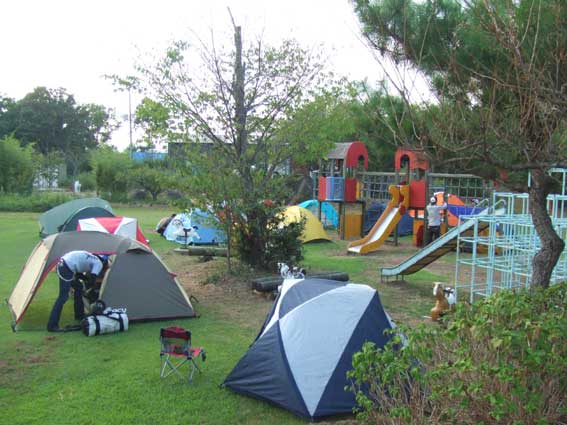 | 湯郷温泉から、さらにバイクでゆったりと1時間ほど走り目的地の津山インター近くの美作の丘会場に到着。オランダ風車のある芝生公園で遊具やミニ動物園もあります。大人数なのでテントの場所を考えて多少早めの4時過ぎに会場入りしましたが、すでに色とりどりのテントが何張りかチラホラありました。夕飯のバーベキューは6時半からなので皆さんそれに合わせてやって来るのです。 シックスグループのテント位置は主催者の意向で毎年、敷地の外れの寂しいスペースと暗黙の了解になっています。以前、夜遅くまで騒いで近所の迷惑になったことがありましたので。 |