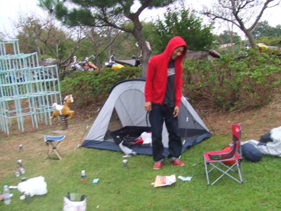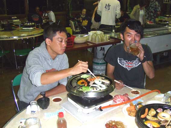 | バーベキューが終わった後も、テントサイトで会話が弾みます。普段なかなかこれだけの人数が集まらないので話の内容は多種多様で真面目な話からエロまでなんでもあり。年齢を超えた男の会話が飛び交っておりました。 おかげで翌朝は二日酔いと寝不足に悩まされましたが、これもミーティングの醍醐味の一つでしょう。コンディションが回復するのを待って昼前に会場を後にしましたが、本当の試練はこれから起こるのでした。 教訓-ミーティングは家に帰るまでがミーティングです。最後まで気を引き締めていきましょう。 |