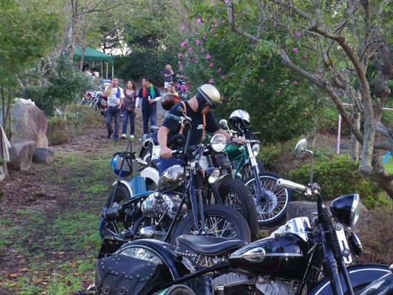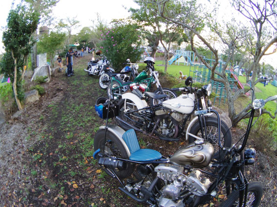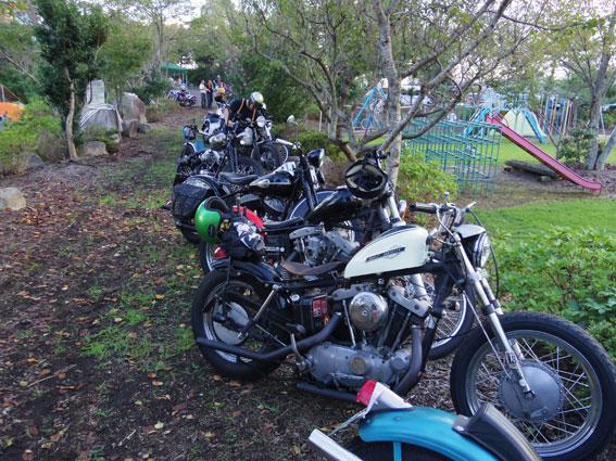 | 湯郷温泉の後は何事もなく、目的地である津山のミーティング会場「美作の丘」へ到着。雨の心配は杞憂に終わったようです。いつも広場を縦断するような小道がシックスの定位置ですのでそこにバイクを止めることになrちます。四国在住のオーナーのため普段は出会う機会の少ないバイクも到着しておりました。 | |