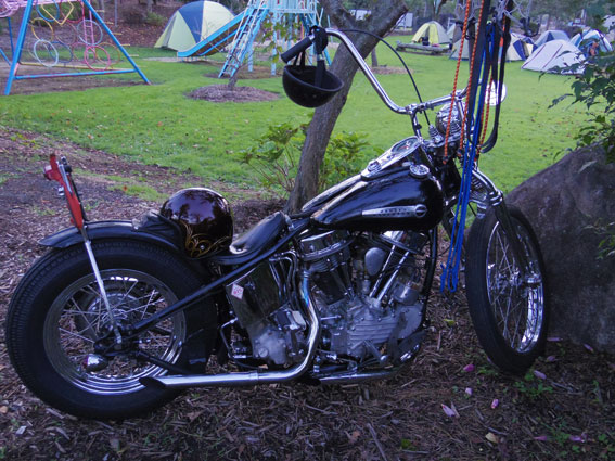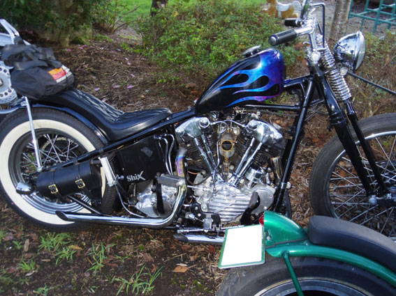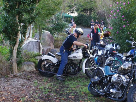 おやおや、主催者である地識さんがストリートファイターを走らせようとしています。同じWL乗りである彼からしてみればセンバが製作したストリートファイターはとても興味があるのでしょう。雑誌などでもよく見かけましたからね。地識さんは意外とミーハー気質だったようです。そういえば、東大阪にあるショップがブログで紹介していた1941年のジプシーツアーのビンテージペナントが気になって仕方がない様子でした。 |