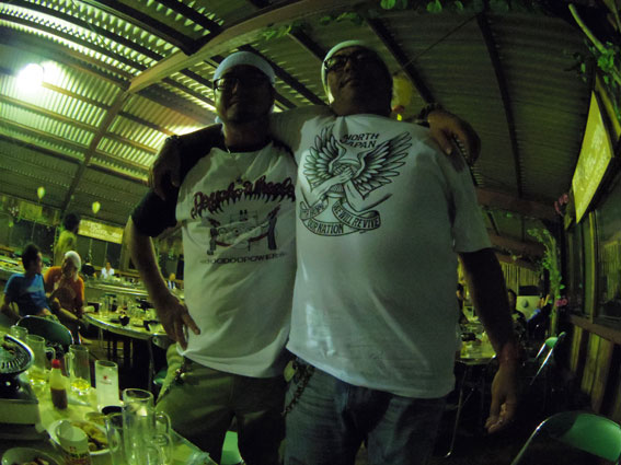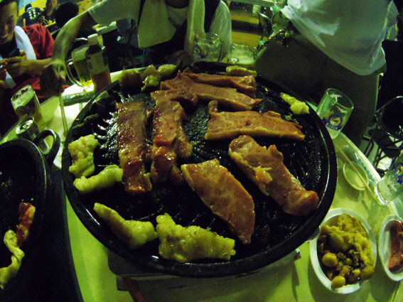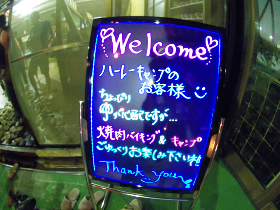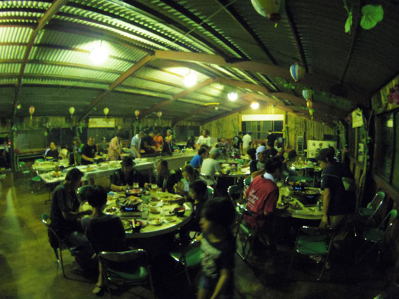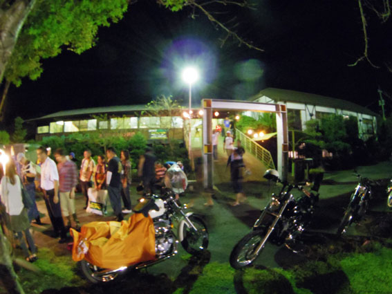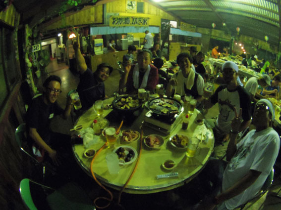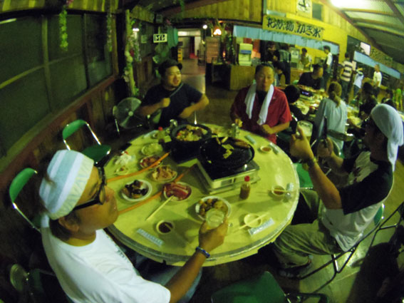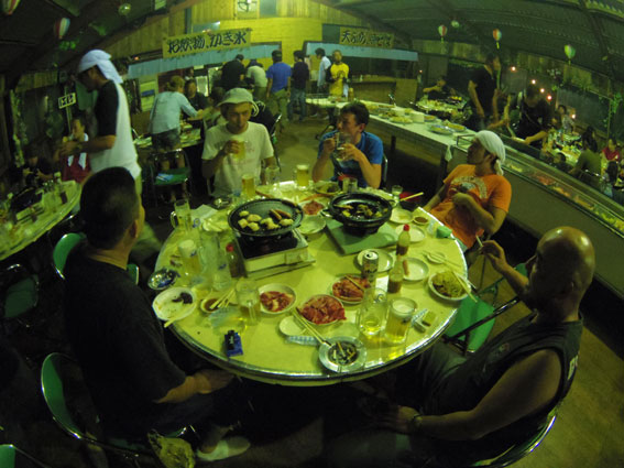 夜も7時を過ぎ、ぞろぞろと連なって広場横の建物にある焼肉バイキング会場へと移動。おのおのテーブルに座り食材コーナーから好きな食材を取りジンギスカン鍋に投入します。気兼ねなくアルコールも飲むことができるし、建物の中なので天気も気にせず飲み食いできるというバイクミーティングではめずらしい環境です。