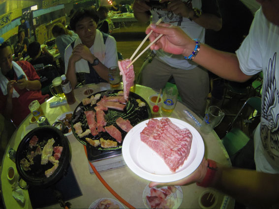 ここでサプライズ。昼飯ジャンケンに負け2万円を払うハメになったヤマザキさんからなんと特上の霜降り牛肉のさし入れがありました。彼はこのようなサービスを考えてくれていましたが、まさか自分がジャンケンに負けて昼飯代金をみんなにさらにサービスするとは考えてはいなかったでしょう。今回のミーティングの食費は彼の功績がたいへん大きなものとなりました。ありがとうございます。 |