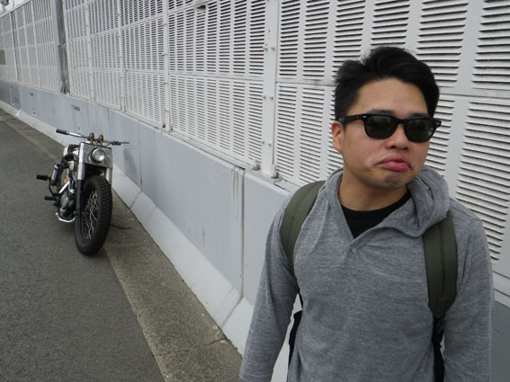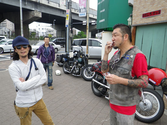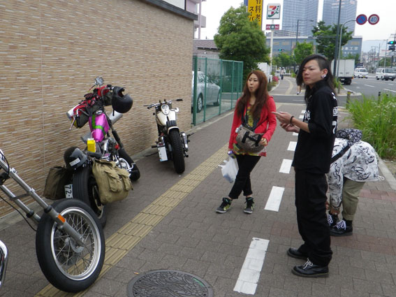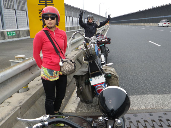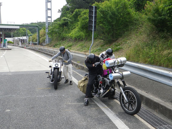 早起きの出店組がすでに会場入りしているであろう時刻の8時に、ようやく集合場所に集まる後発バイク組のメンバーたち。会場には昼前に着ければいいだろうと一般参加気分の余裕のスケジュールのはずでした。ところが、阪神高速道路に入った途端に電光掲示板の「阪神神戸線全線通行止め」の文字が目に入ります。どうやら大掛かりな道路改修工事があるらしく、事前に調べればすぐに判るはずでしたが、天気の心配ばかりしていたのでその方面にはノーチェックと大きな誤算でした。 |
