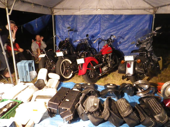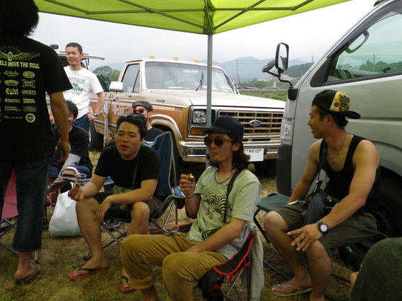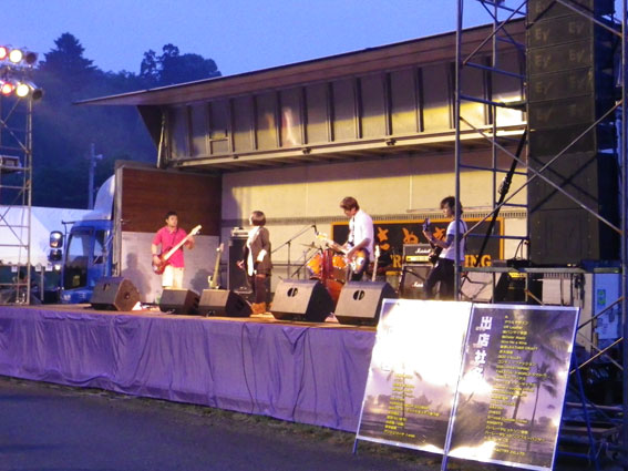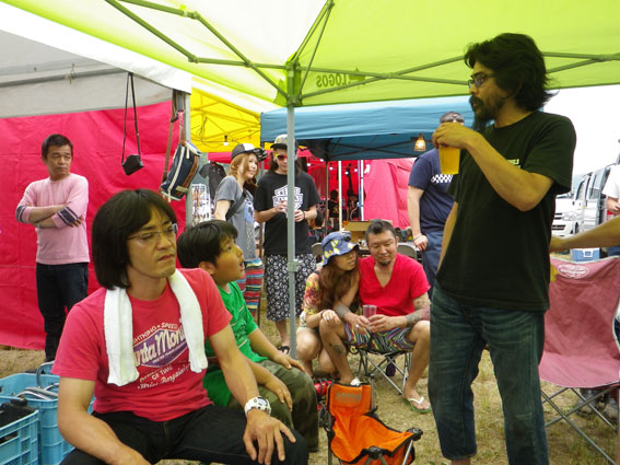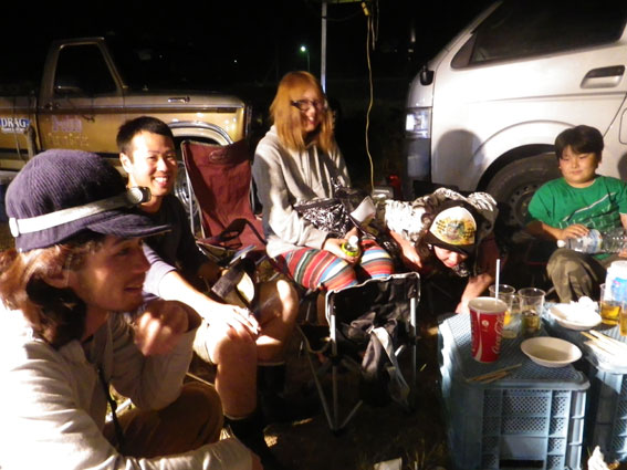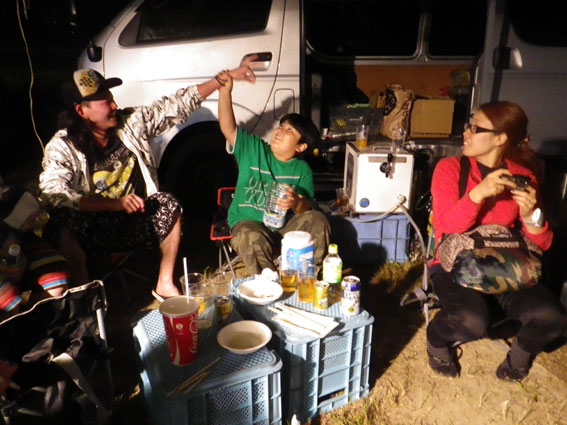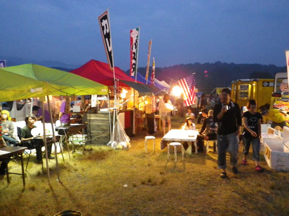 | ビールでほろ酔い気分で過ごすうちにスポーツイベントも初日のスケジュールが終了する時刻になると、日も暮れ辺りが暗くなりブースのあちらこちらでライトが点灯されると会場内は昼間とはまた違った雰囲気に包まれます。ステージ上ではライブバンドの演奏が始まり、メロディに誘われてキャンプエリアから人が流れてくるにしたがって飲食ブースも活気づいてきました。 気分直しに近場の温泉まで送迎バスで出掛け汗を流すと、改めてシックスブース夜の部の開始となります。とはいえ、過度のアルコール飲酒のため夜の部には何をしたかはよく覚えていないのですが、さぬきうどんとビールのセットで気持ち良く夜は更けていったような気がします。時に、夕方から夜にかけて1人爆睡していたので迷惑にも深夜に元気一杯の「寝かせへんでオバケ」がテントサイトに出現したようですが、残念なことに私には記憶にありません。 |