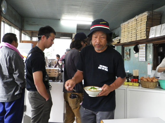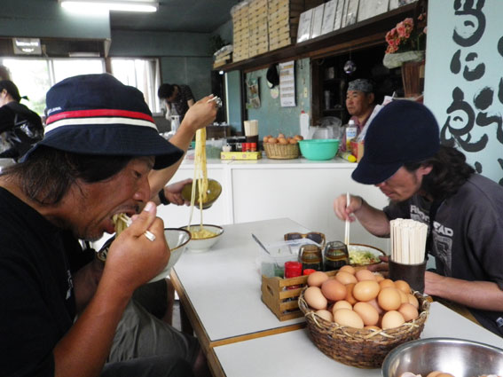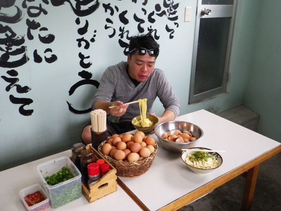 | お昼になり、会場で出店しているうどんは昨日から何杯も食べているにもかかわらず、違う味を求めて近くの製麺所へと足を運びます。もちろん讃岐に来たのですから2日連続3食うどんでもなんら問題ありません。会場から山地方面へ10分足らずの町内にある看板もない小さな製麺所でしたが、口コミ情報で有名なのでしょう開店するや次から次へとお客が入ってきました。うどんにトッピングさせる生卵の柔らかな口当たりとピリリと辛い唐辛子スパイスとの組み合わせが大阪育ちの私にはとても新鮮でした。 | |